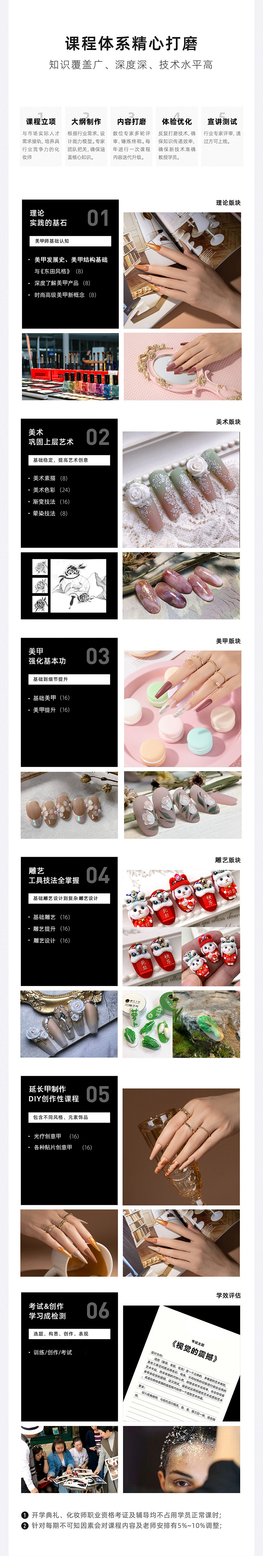 光疗产品的认识与操作及光疗创意甲、琉璃甲的制作 各种贴片的认知、制作技巧及光疗延长甲卸除方法 圆笔工具认知及圆笔基础彩绘技法(五瓣花,紫荆花等基础花卉) 美甲雕艺基础款式制作(卡通,玫瑰) 3D艺术美甲彩绘工具材料认识与3D排笔彩绘基础花卉技法 综合练习,学习总结